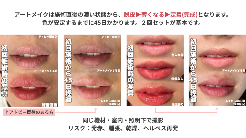 リップアートメイクは個人差はありますが、2〜3回でしっかり色が定着します。初回はベース作り、2回目でお好みに合わせた仕上がりに近づけていくイメージです。基本的には2回で終了です。3回目や数年後のリタッチも、続けやすいアフターフォロー価格になっていますので、どうぞ安心してお任せください。
